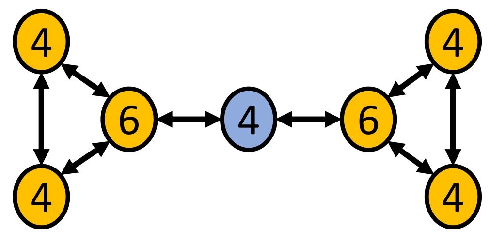 각 원은 소셜 네트워크를 구성하는 개인을 나타내며 화살표 연결은 개인 간 상호작용을, 숫자는 각 개인의 상호작용 수를 나타낸다. 왼쪽 노란색 원들과 오른쪽 원들이 연결되려면 파란색 원을 반드시 거쳐야 하기 때문에 파란색 원의 매개 중심성이 노란색 원들보다 더 높다.