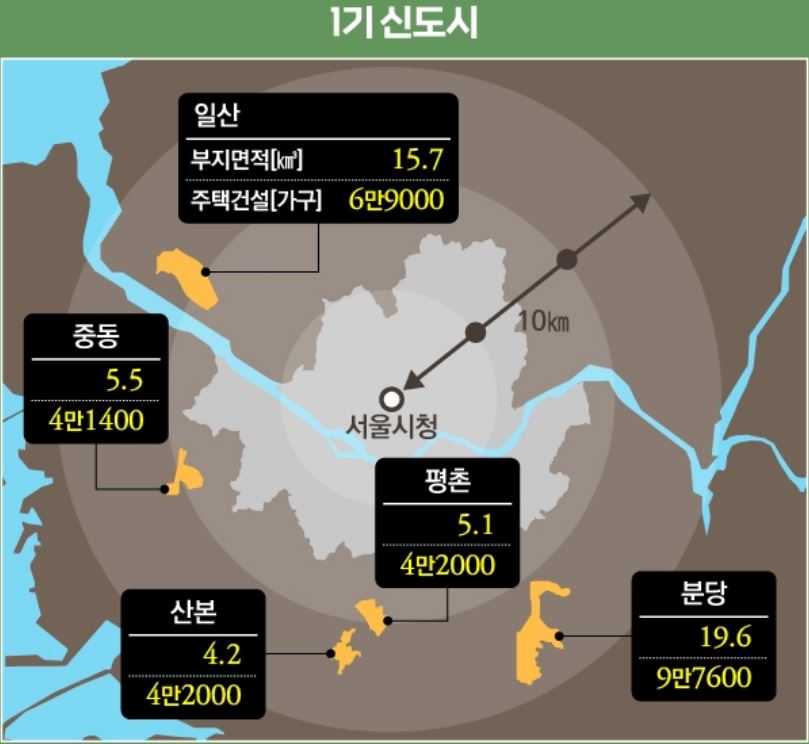경기도에 위치한 1기 신도시는 △성남시 분당 △고양시 일산 △부천시 중동 △안양시 평촌 △군포시 산본 등 5곳, 총 29만2000가구로 오는 2026년까지 대부분의 단지가 재건축 연한(30년)이 도래한다.