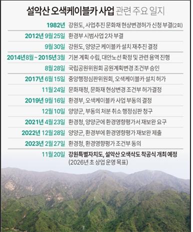 설악산 오색케이블카 설치사업은 1982년 10월 최초 계획 입안 이후 국립공원 내에 케이블카가 설치된다는 점에서 환경단체 등의 극렬한 반대로 더디게 진행되다가 2015년 9월 내륙형 국립공원 삭도 설치 시범사업으로 선정되면서 급물살을 탔다.