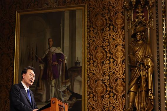 영국을 국빈 방문 중인 윤석열 대통령은 21일(현지시간) 웨스트민스터 의회 로열 갤러리에서 한 영어 연설에서 “한국과 영국이 긴밀히 연대해 세상의 많은 도전에 함께 응전해 나가야 한다”고 말했다.