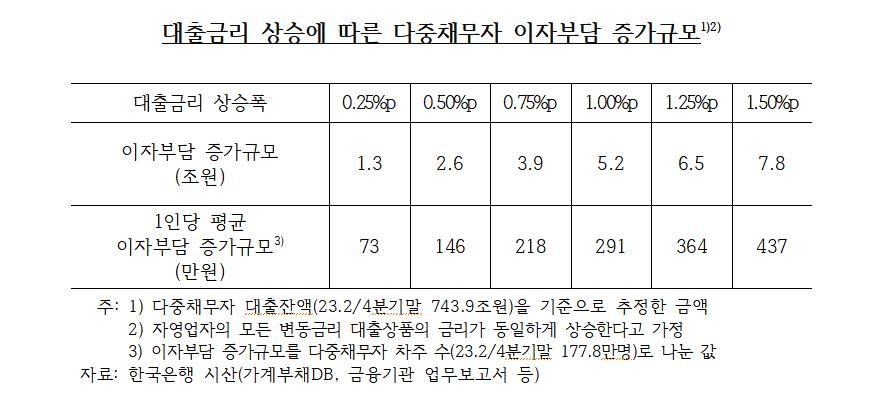 한은이 자영업 다중채무자 대출 규모(2분기 말 743조9천억원)와 변동금리 비중(추정치 64.5%)을 바탕으로 분석한 결과, 금리가 0.25%포인트(p) 높아질 때마다 전체 이자는 1조3천억원 늘어난다. 1인당 평균 이자 부담 증가액은 연 73만원 정도다. 금리가 1.0%p 오르면 전체와 1인당 평균 이자는 각 5조2천억원, 291만원 급증한다.