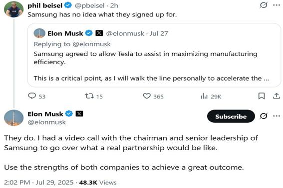 머스크는 이후 또 다른 엑스 이용자가 “삼성전자는 칩 제조 기술에서 TSMC보다 뒤처져 있다. 삼성전자가 테슬라의 AI6 칩에 적용되는 새로운 2나노미터 기술을 실현할 수 있을지 미지수다. 삼성이 못하면 AI6 역시 TSMC와 함께할 가능성이 있다”는 내용의 글에도 “TSMC와 삼성 둘 다 훌륭한 회사들”이라며 “그들과 함께 일하는 것은 영광이다”라고 답글을 달았다.