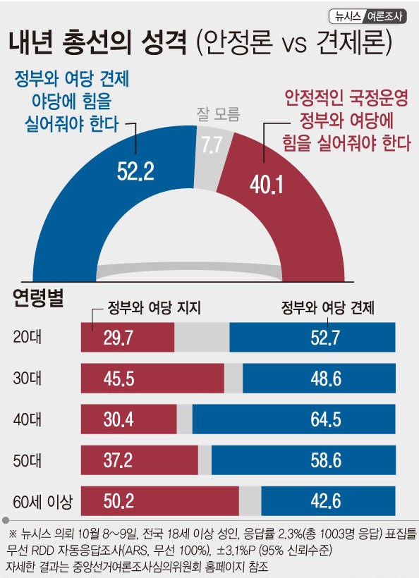 내년 총선…정권 안정론 40.1% 정권 견제론 52.2%