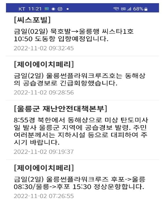 울릉알리미를 통해 울릉군재난안전대책본부는 ‘북한에서 동해상으로 탄도 미사일 발사, 울릉군 지역에 공습경보 발령, 주민 여러분께서는 지하시설 등으로 대피해 주시기 바랍니다”라고 보냈다. 울릉주민들은 문자를 받고 나서도 북한 미사일이 언제 어디서 발사됐는 지, 왜 대피해야 하는 지, 어디로 언제까지 대피해야 하는 지 안내가 전혀 없어 어리둥절해 했다.