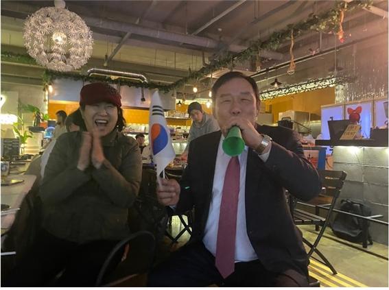 기다리던 오후 10시 심판의 호루라기와 함께 호프집에 모인 70여명의 대한민국 세종 응원단들은 함성과 함께 첫 승을 염원하며 손에 든 태극기를 흔들며 100인치 모니터를 응시했다. 대한민국이 열세라는 도박사의 예측 속에 어려울지도 모른다는 ‘낭설’에 반발하듯 이들의 응원은 어느 때보다 강렬했고 세종시 호프집에서 카타르까지 함성을 날려 버려야 한다는 의지가 담긴 듯 맹렬한 열기를 뿜었다.