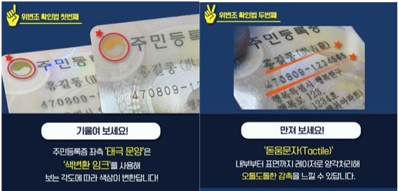 지난 2020년 1월1일 이후 발급된 주민등록증은 ▲성명과 주민등록번호 부분이 돋움 처리돼 만져보고 오돌도돌한 촉감이 있는지 여부 ▲좌측 상단의 태극 문양이 빛의 방향에 따라 금색과 녹색으로 색상이 변하는지 여부 ▲좌측 하단의 작은 사진이 보는 각도에 따라 이미지와 숫자(생년월일)가 번갈아 나타나는지 여부를 확인하면 된다.