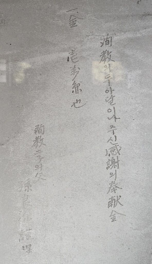 놀랍게도 손 목사는 두 아들이 순교했다며 감사하는 헌금을 했다. 기념관에서 헌금 봉투를 확인할 수 있었다. 거기에는 “순교의 두 아달(아들)이나 주신 감사의 봉헌금”, “순교 2자(子)의 부 손양원”이라고 적혀 있다.