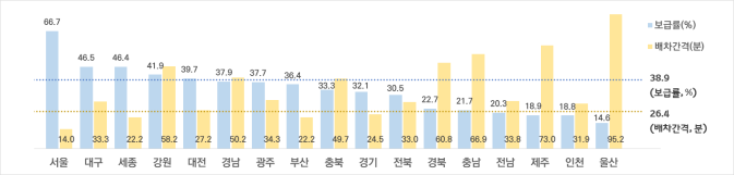 저상버스 배차간격은 2023년 전국평균 26.4분으로 ‘22년 26.8분에서 일부 개선이 되었으나, 지역 간 최대 81.2분의 편차가 있었다. 2023년 저상버스 도입 노선 수는 2,497개로 2022년 1,831개 대비 666개 노선이 증가했다.