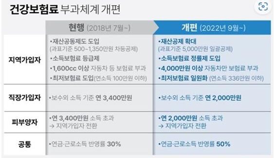 이 후 2018년 7월부터 소득 중심으로 건보료 부과체계를 개편하면서 1단계(2018년 7월∼2022년 8월)로 기준소득을 ‘연간 3천400만원 초과’로 내린 데 이어, 올해 9월부터 2단계로 ‘연간 2천만원 초과’로 더 낮춰 소득월액 보험료 부과기준을 강화했다.