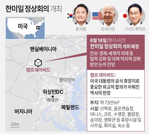 윤석열 대통령과 미국 조 바이든 대통령, 일본 기시다 후미오 총리가 참석하는 ‘한미일 정상회의’가 다음 달 18일(현지시간) 미 워싱턴 인근 대통령 별장인 ‘캠프 데이비드’에서 개최될 것으로 20일 알려졌다. 윤석열 대통령과 미국 조 바이든 대통령, 일본 기시다 후미오 총리가 오는 18일(현지시간) 미국 캠프데이비드에서 나란히 ‘친교 산책’을 즐기는 모습이 연출될 것으로 보인다.